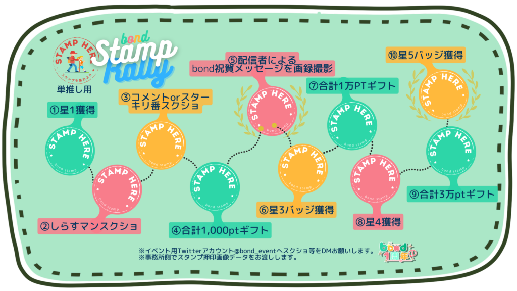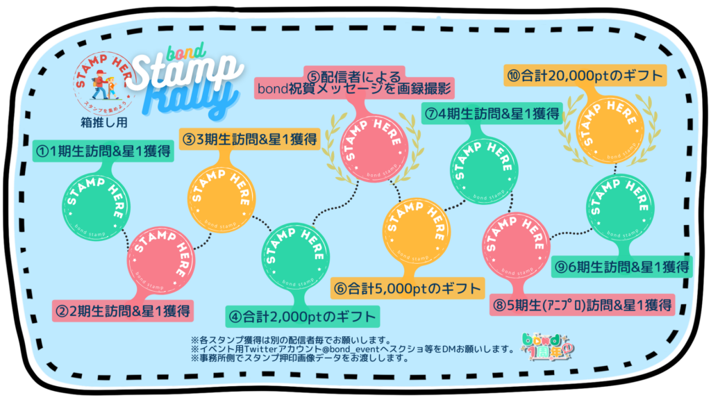 ※スタンプラリーはbond用、単独者用どちらでも可能です。何度でも参加可能となり、その際も1枚目とは別の配信者にご訪問ください。複数枚獲得することにより、当選確率が上がります。